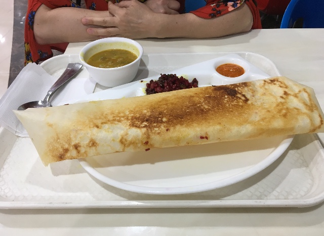 Dosa nebo-li největší slaná „palačinka“, kterou jsme kdy spořádaly. Místní Ind nás zamračeně napomenul, že nejde o palačinku, tak snad si tohle nepřečte. 6/10, pardon.